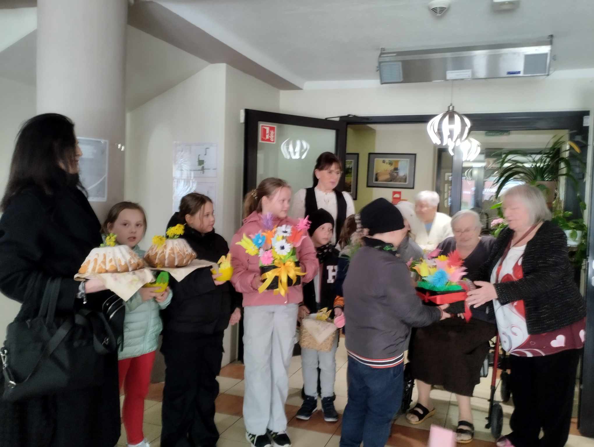 W dniu 8 kwietnia uczniowie świetlicy szkolnej wraz z nauczycielami odwiedzili mieszkańców Domu Pomocy Społecznej nr 2 w Sosnowcu. W trakcie wizyty przekazano seniorom serdeczne życzenia od Dyrekcji Szkoły, nauczycieli i uczniów życząc im zdrowia, szczęścia i spokoju na nadchodzące święta Wielkanocne. Dzieci przygotowały własnoręcznie wykonane wiosenne papierowe kwiaty oraz zajączki, które wręczyły mieszkańcom jako symbole wiosny i radości. Dodatkowo seniorom podarowano upieczone babki wielkanocne oraz rośliny - rzeżuchę i owies wielkanocny, będące tradycyjnym elementem świątecznego wystroju. Spotkanie przebiegło w serdecznej atmosferze, pełnej uśmiechów i wzruszeń. Była to piękna okazja do budowania więzi międzypokoleniowych oraz niesienia radości i otuchy.
