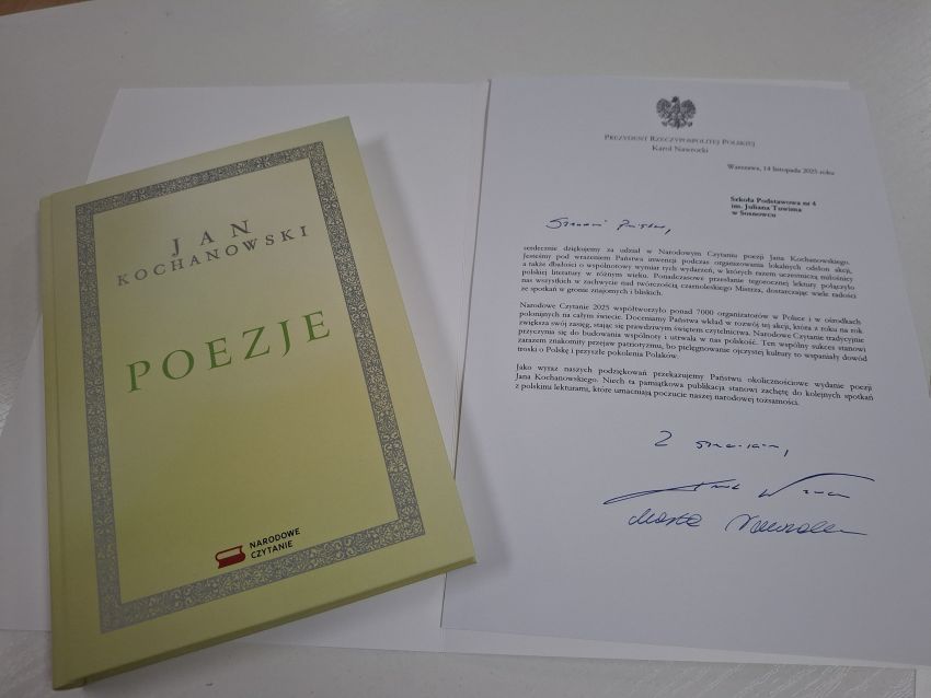 Nasza szkoła otrzymała dziś wyjątkowe podziękowania za udział w tegorocznej akcji Narodowe Czytanie, przesłane przez Prezydenta Karola Nawrockiego oraz jego małżonkę Martę Nawrocką.
