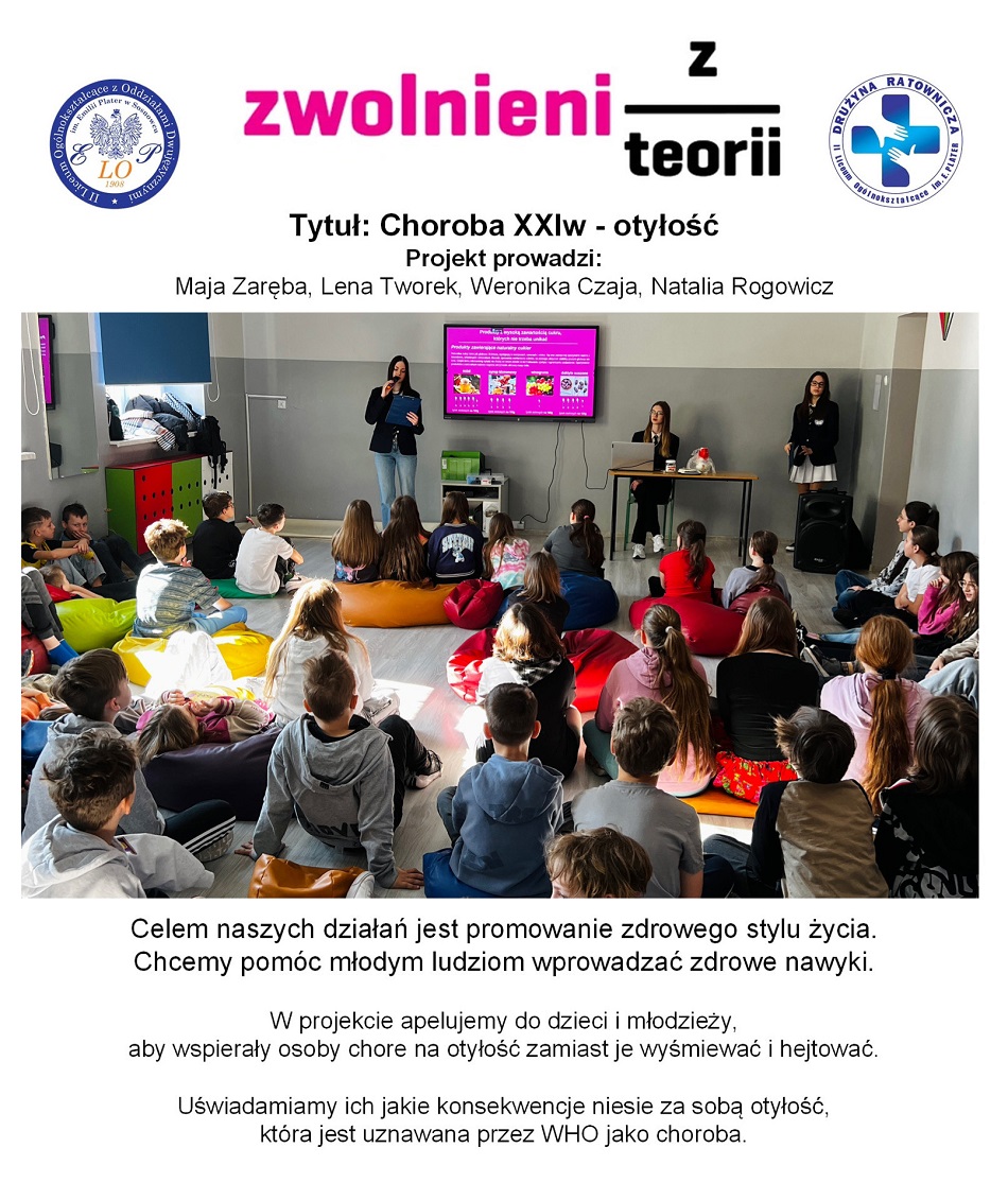 W dniu dzisiejszym uczennice Liceum Ogólnokształcącego im Emilii Plater: Maja Zaręba, Lena Tworek, Natalia Rogowicz oraz Weronika Czaja zaprezentowały uczniom Naszej Szkoły efekty pracy nad projektem "Zwolnieni z teorii". Projekt ten bardzo szeroko zgłębia problem otyłości. Nasi uczniowie mieli okazję dowiedzieć się czym jest otyłość, jakie są skutki tej jakże powszechnej choroby. Uczennice w bardzo ciekawy sposób zaprezentowały Nam treści związane z tym jak zapobiegać tej chorobie. Na co należy zwracać uwagę w życiu codziennym: jak szukać zamienników niezdrowych produktów, czego szukać na etykietach produktów podczas zakupów. Uczniowie mieli okazję zobaczyć jak badamy sobie poziom cukru. Podkreślona została ważność aktywności fizycznej oraz zdrowej diety. Bardzo dziękujemy uczennicom LO im Emilii Plater za zaangażowanie i profesjonalizm. Opiekunem projektu jest Pan Marek Bartoń.