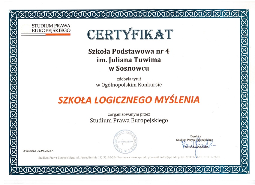 Nasza szkoła otrzymała certyfikat „Szkoła Logicznego Myślenia”! To efekt udziału uczniów klas IV–VIII w ogólnopolskim projekcie edukacyjnym, który realizowaliśmy od października do stycznia. Było sporo wyzwań: konkurs „Mistrz Sudoku”, logiczne zabawy „Prawda czy fałsz”, gra terenowa „Ślimak”, konkurs „Mądra Głowa” i wiele innych aktywności rozwijających kreatywność, współpracę i matematyczne myślenie. Uczniowie pokazali, że potrafią logicznie analizować problemy, argumentować swoje pomysły i świetnie działać zespołowo. Gratulujemy wszystkim uczestnikom i dziękujemy nauczycielom za zaangażowanie