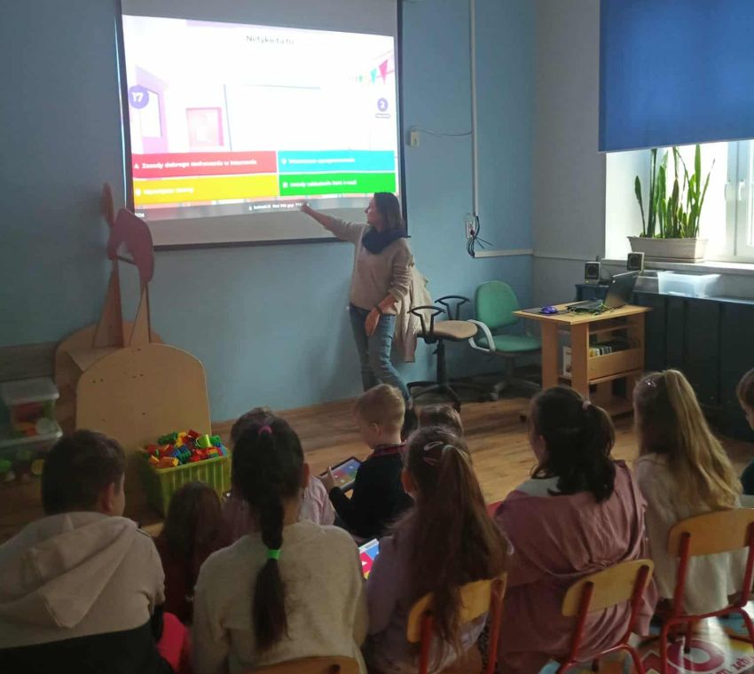 Dzieci obejrzały film edukacyjny „Plik i Folder – Odkrywcy Internetu”, a następnie wspólnie omówiły problem nadmiernego korzystania z Internetu, komputera i gier komputerowych. Na zakończenie, w ramach podsumowania zdobytej wiedzy, uczniowie pracowali w grupach i wzięli udział w interaktywnej zabawie Kahoot.