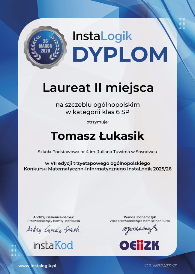 Z ogromną dumą informujemy, że uczeń klasy 6b, Tomasz Łukasik, zdobył II miejsce w ogólnopolskim Konkursie Matematyczno-Informatycznym InstaLogik 2025/2026!