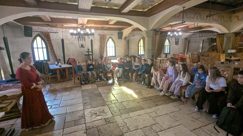 Nasza wycieczka do Warowni Pszczyńskich Rycerzy rozpoczęła się od przekroczenia wielkiej bramy warowni, za którą czekał świat dawnych wojów. Braliśmy udział w nauce średniowiecznych tańców, oglądaliśmy pokaz strojów i zbroi rycerskiej, a także własnoręcznie wypiekaliśmy tradycyjny chleb.Nie zabrakło również czasu na zakup pamiątek, dzięki którym każdy mógł zabrać ze sobą mały fragment rycerskiej przygody. Na zakończenie czekała nas jeszcze beztroska zabawa na placu zabaw oraz strzelanie z łuku— idealne podsumowanie pełnego atrakcji i niezapomnianych wrażeń dnia.