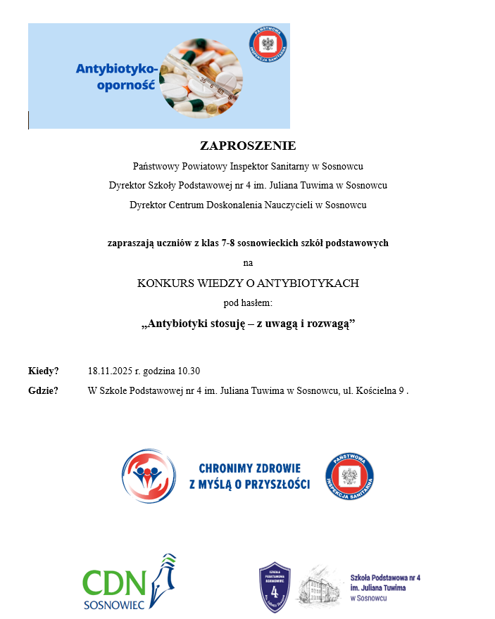 Państwowy Powiatowy Inspektor Sanitarny w Sosnowcu zaprasza na dzień edukacyjny zaplanowany w dniu 18 listopada br. do Szkoły Podstawowej nr 4 w Sosnowcu. Podczas Tygodnia Wiedzy o Antybiotykach będziemy edukować jak z uwagą i rozwagą zażywać antybiotyk oraz jak dbać o zbilansowaną dietę. Wydarzeniu na terenie szkoły będzie towarzyszyć wystawa plakatowa pod hasłem: Superbakterie oporniaki.